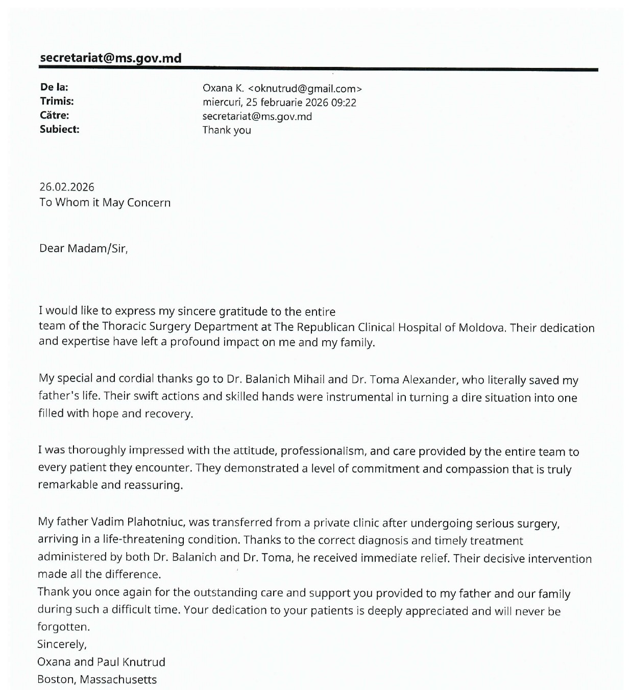 Recunoștință care ne motivează Am primit o scrisoare de mulțumire din partea unor pacienți de peste hotare, adresată echipei Secției de Chirurgie Toracică. Mulțumiri speciale au fost adresate medicilor Mihail Balanici și Alexandru Toma, pentru intervenția promptă care a făcut diferența într-un caz critic. Astfel de mesaje ne inspiră să