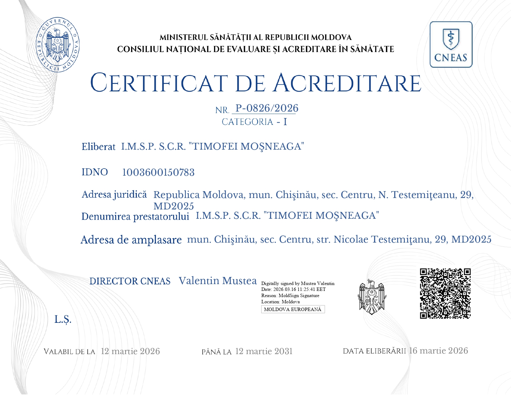 Certificat de acreditare nr. P-0826/2026 Categoria-I din 16.03.2026
