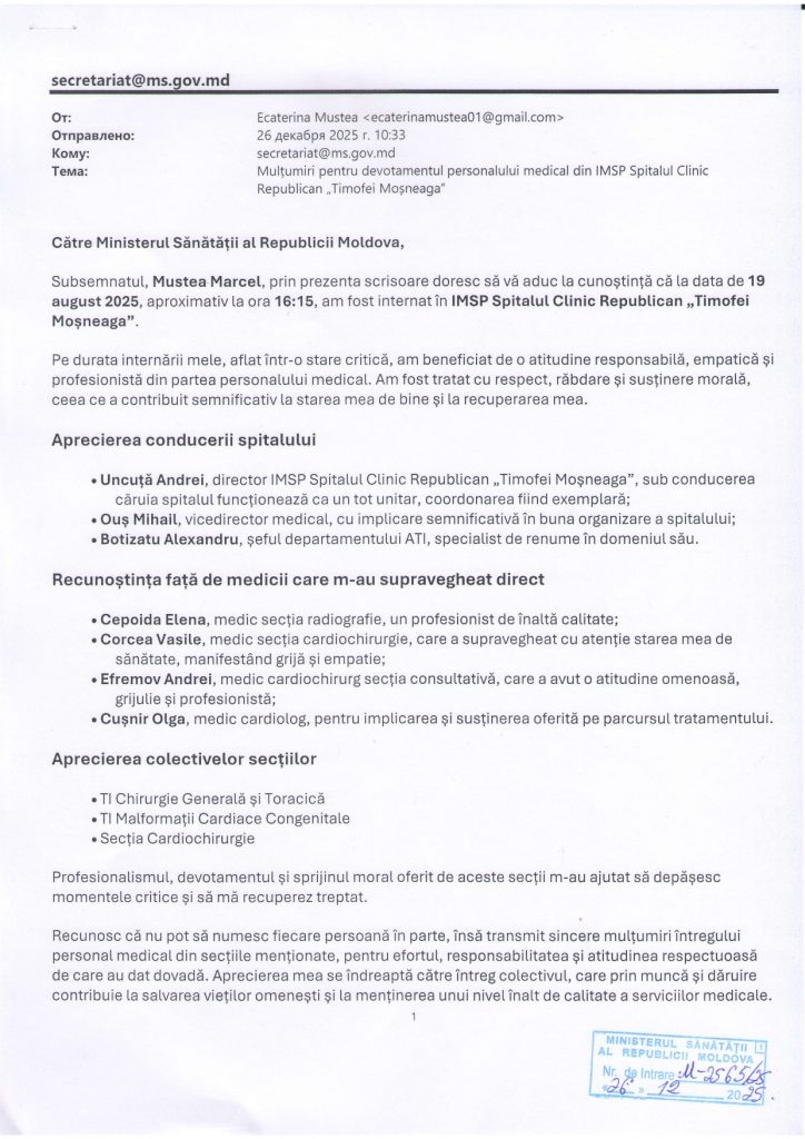 Pacientul Marcel Mustea aduce mulțumiri sincere echipei medicale din secțiile de Cardiochirurgie, ATI și Imagistică pentru atitudinea responsabilă și grija manifestată pe durata internării.